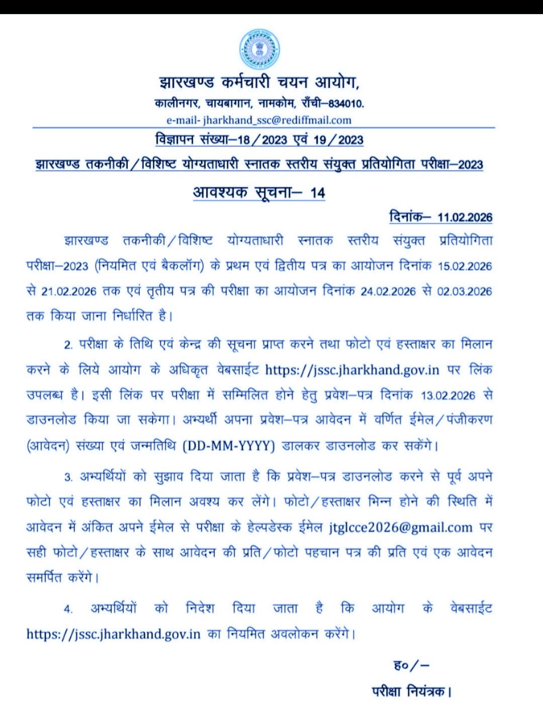 The Jharkhand Staff Selection Commission (JSSC) has officially announced the release of the Technical / Special Qualification Graduate Level Combined Competitive Examination–2023 Admit Card. Candidates who have applied under Advertisement No. 18/2023 & 19/2023 can now download their hall ticket from the official website.
